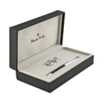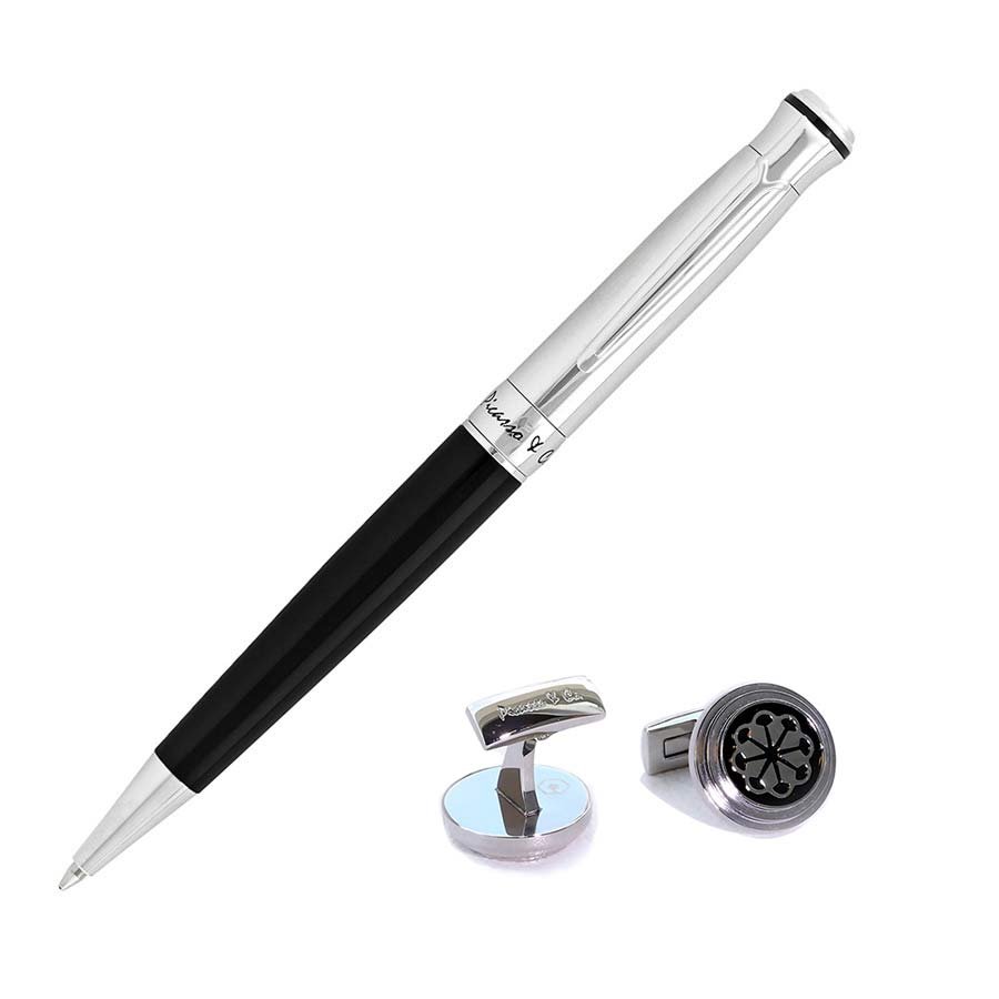 pen: Ballpoint pen crafted in rhodium-plated brass with black lacquer.